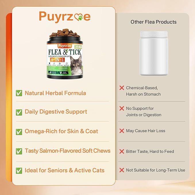 - All Sizes and Breeds: Puyrzoe flea treatment for cats chewables are an excellent daily supplement for cats of all breeds and sizes, providing gentle and consistent support. Whether your cat is a kitten, adult, or senior, these cat flea and tick treatment chewables provide reliable, everyday protection. Unlike traditional flea and tick care, such as drops, sprays, or shampoos, our natural flea and tick prevention for cats chewables offer a milder, more convenient option to keep your cat safe and comfortable.