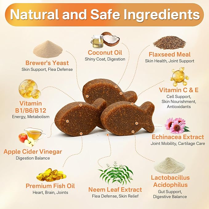 - Natural 4-in-1 Flea & Tick Defense: Puyrzoe Natural 4-in-1 flea treatment for cats chewables feature unique and natural ingredients, including Neem, Brewer's Yeast, Echinacea Extract, and VITAMIN B1, B6, B12. This daily supplement not only helps support a natural balance approach to flea and tick care, but also supports skin & coat health and immune health. Especially suitable for active outdoor cats and seniors, helping them soothe itching and enjoy natural protection.