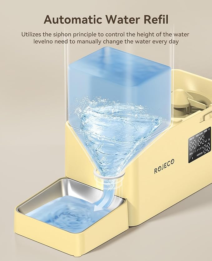 Rojeco 36Cups/8.5L Pet Automatic Cat Feeder and Gravity Water Dispenser,Stainless Steel Bowls 2-in-1 Set Large Capacity 5L Food Feeder and 3.5L Water Fountain for Cats,Pets,Small Dogs,Yellow