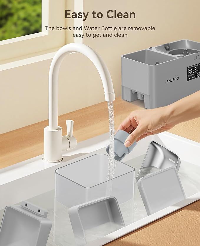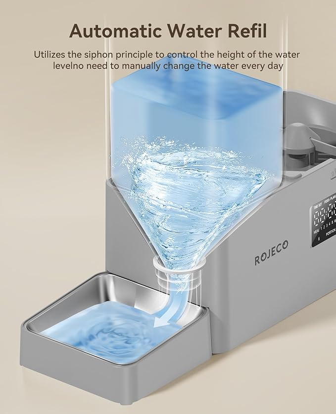 Rojeco 36Cups/8.5L Pet Automatic Cat Feeder and Gravity Water Dispenser,Stainless Steel Bowls 2-in-1 Set Large Capacity 5L Food Feeder and 3.5L Water Fountain for Cats,Pets,Small Dogs,Grey