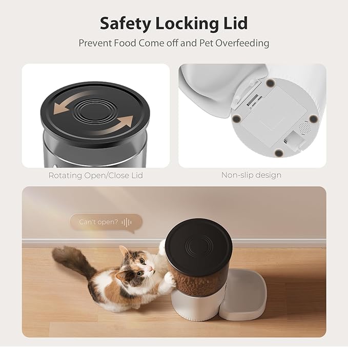 - "One-touch Operation & Easy Cleaning: Built-in LCD screen simplifies setup. Press the ""up"" and ""down"" buttons simultaneously to manually feed 1 serving instantly. Optimized angled feeder prevents food jams, and removable food tray allows for thorough cleaning. Secure lid lock design effectively prevents pets from stealing food