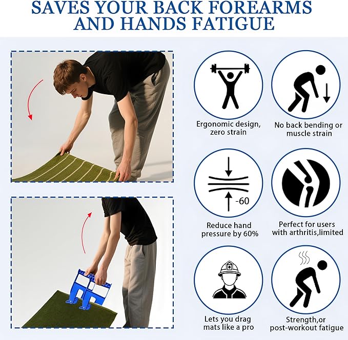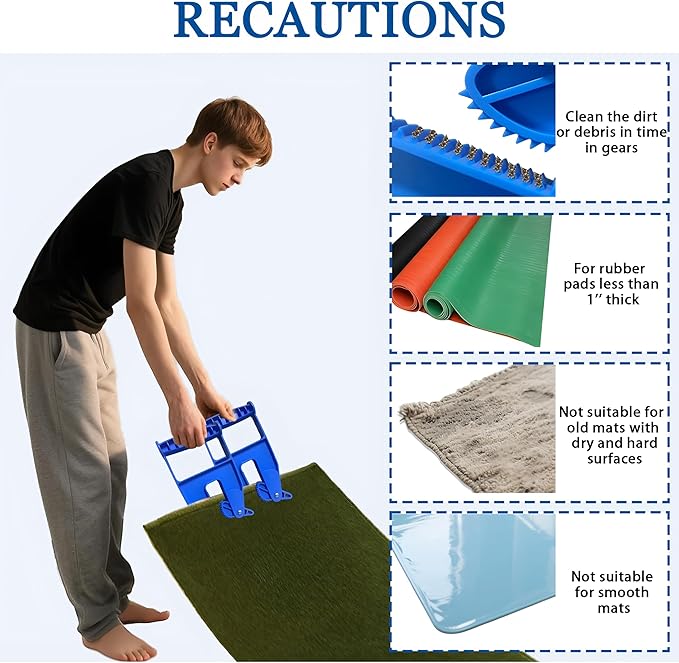 - 【Important Notes】Please be aware that our Mat Movers Tool has usage limitations in certain conditions. It may not perform effectively if the plastic teeth are clogged with dirt or debris, as this can reduce grip strength. Additionally, the tool is not suitable for old, dry, hard mats or smooth surfaces, as grip may not hold properly. Always ensure that mats are in the appropriate condition for optimal performance