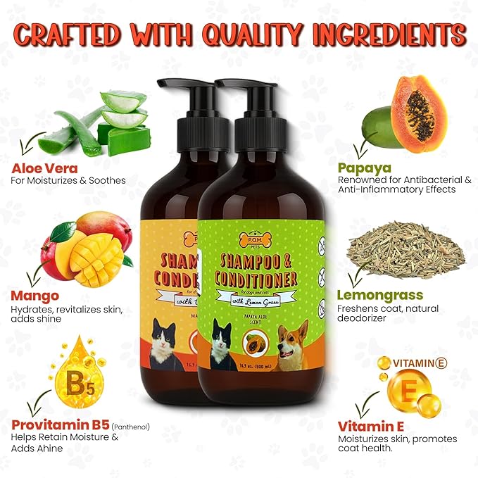 - "EASY 2-IN-1 GROOMING FOR DOGS & CATS: Simplify bath time with this convenient dog shampoo, combining cleaning and conditioning in one effective step. Perfect for busy pet parents, It works as both dog shampoo and conditioner as well as organic cat shampoo and conditioner, making it great for both dogs and cats care."