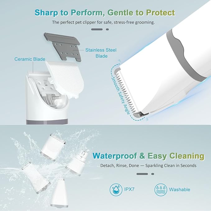 - Safe and Easy to Clean: Featuring stainless steel and ceramic blades, our dog grooming clippers ensure quick trimming, no pull the pet hair and no hurt the pet’s skin. The blades of dog nail trimmer are detachable and washable, which can be directly rinsed underwater after use, making it easier to clean