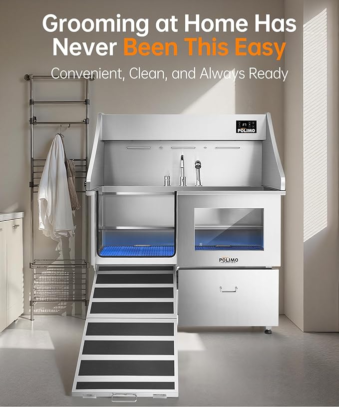 - Premium Stainless Steel Build & Smart Design : Crafted from rust-resistant 304 stainless steel with a full-welded, leak-proof structure, this dog tub is built to last. It features a Grade-A tempered glass viewing window (Eases pet anxiety); A foldable ramp (For easy access, especially for senior dogs); A removable two-piece floor grate (3 height adjustments for large, medium, and small dogs); And a sliding storage drawer (Keeps grooming tools organized). Every detail is designed for a more professional, comfortable, and efficient dog shower tub experience