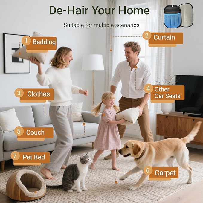 - 【Electrostatic deep cleaning with a dual-textured】High-density brush surface targets embedded hair in fabrics. It attracts surface loose fur through frictional static electricity while capturing deep-seated pet hair. Suitable for furniture upholstery, carpets, curtains, pet beds, cat trees, and car interiors