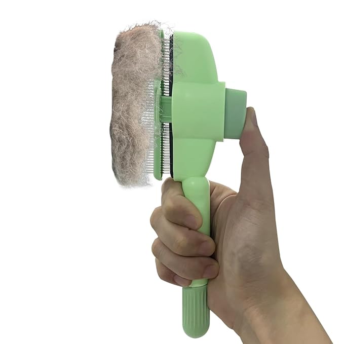 - One click self-cleaning: After cleaning your pet, simply click the self-cleaning button. The shutter will pop out, separating the brushed hair from the metal needle, then wipe the hair off. The button of cat shedding brush on the pet brush saves time and energy when grooming and cleaning.