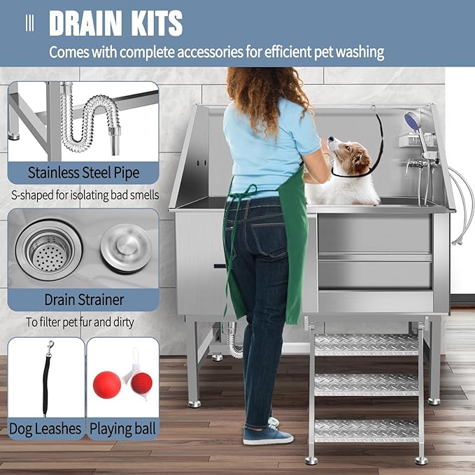 - 3. Smart & Convenient Features: Multi-functional faucet with hot/cold water and showerhead with comb teeth.S-shaped stainless steel drain pipe for fast, clog-free drainage. Shower rack for organized storage—everything you need for a full grooming session at home!
