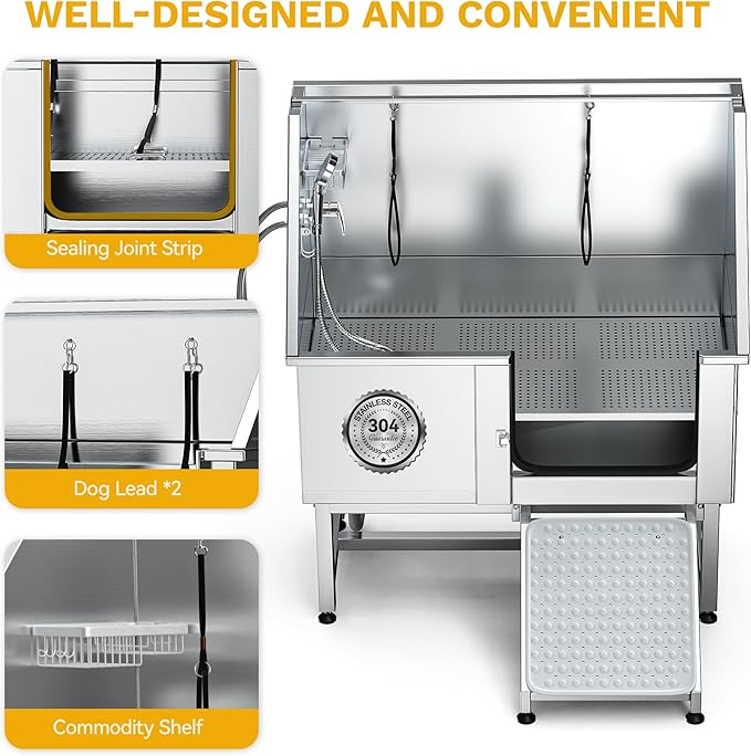- Durable 304 Stainless Steel Tub Body: With a 330 lb weight capacity, this pet bathtub is built for long-lasting use; The fully welded, one-piece design prevents leaks, while the smooth surface allows for easy cleaning and maintenance