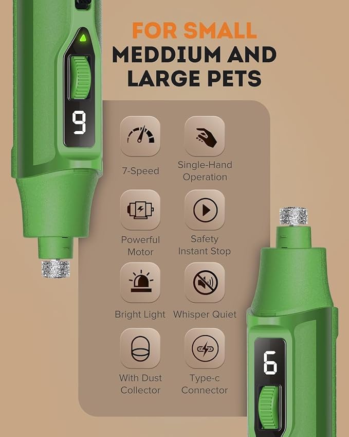 - 7 SPEEDS ADJUSTABLE: Ranging from 8,000 to 15,000 RPM, as one of the most powerful grinders, ideal for trimming the nails of small, medium, and large dogs, cats, birds, and other small animals